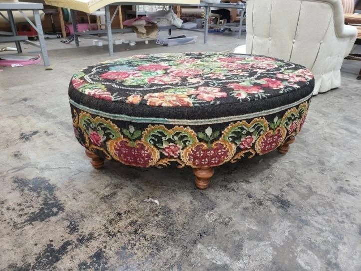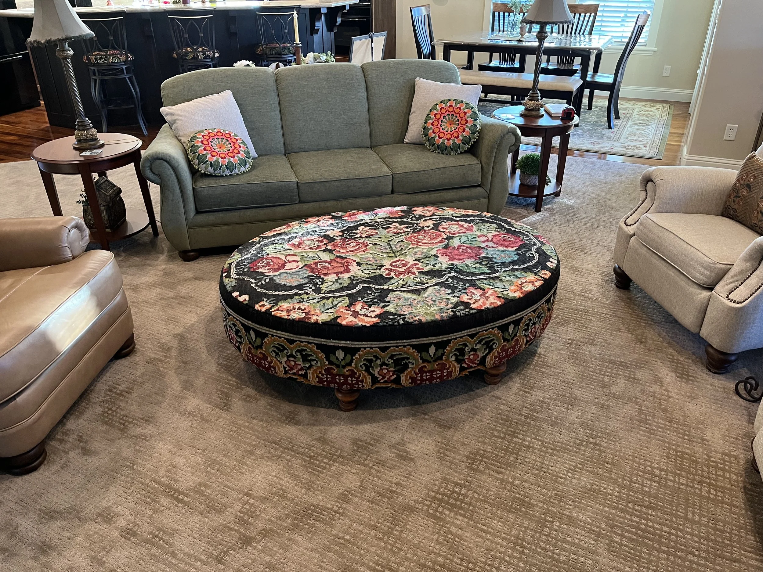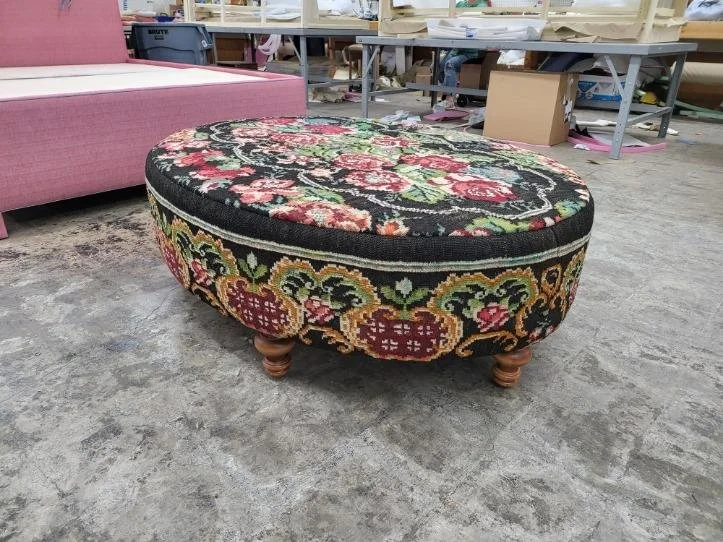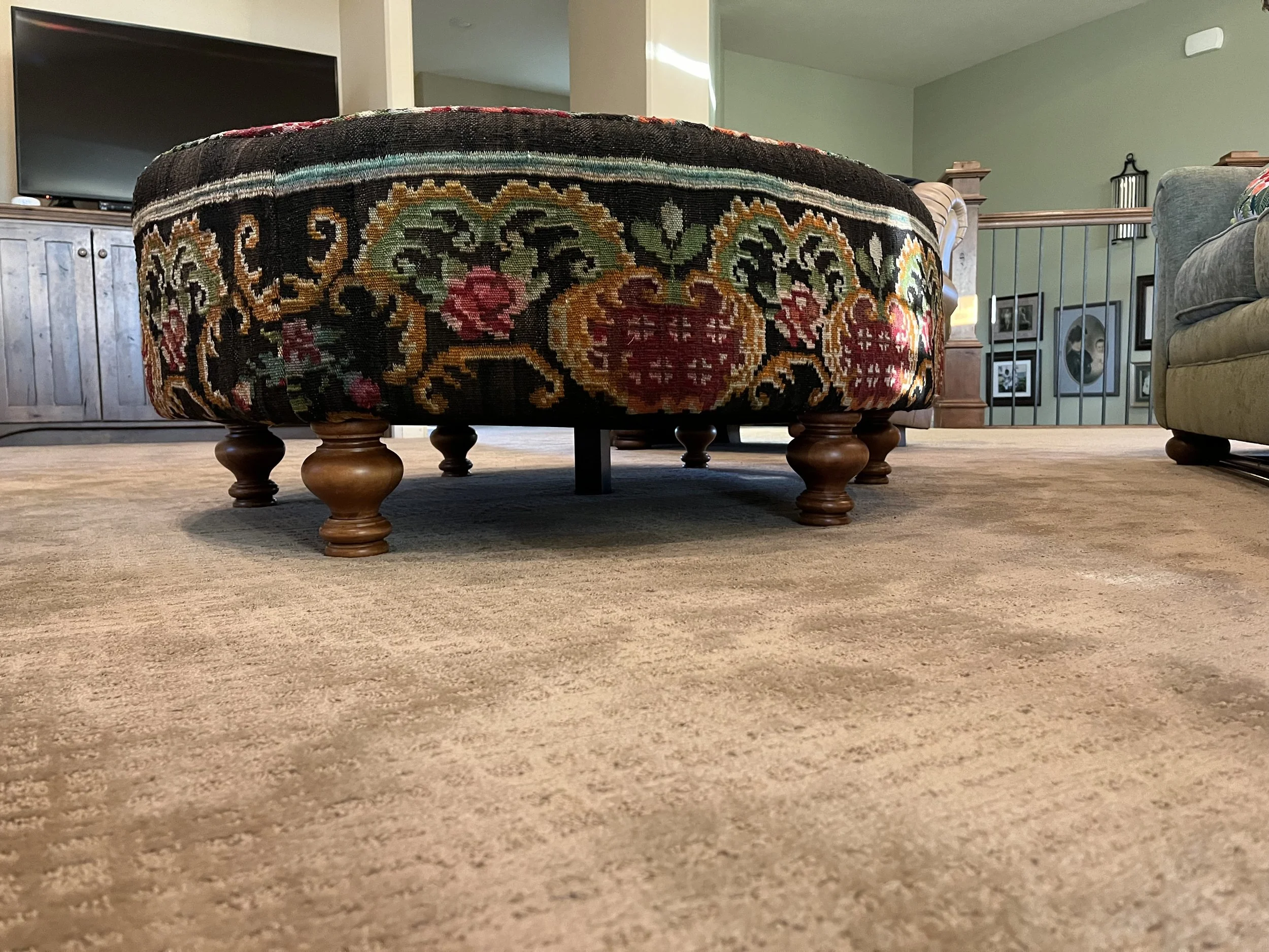 Working on this project with Greg Thayer, a grandson of Edwin, was truly one of the most fun projects I have ever had the opportunity to be a part of! We sent him the rug, and the dimensions we wanted the ottoman to be. He would call and text with pictures of what it would look like in different oval shapes using the design of the actual rug.