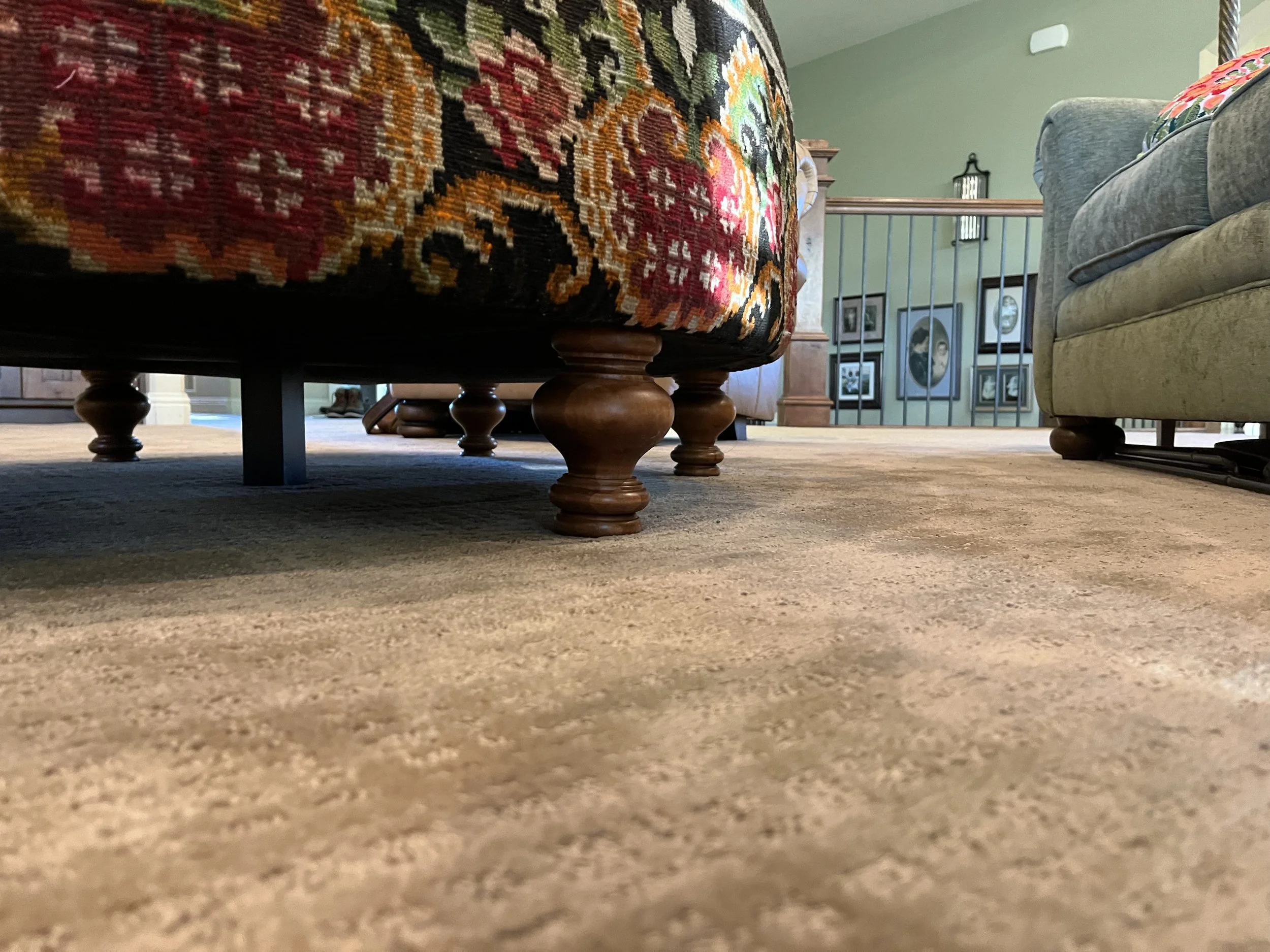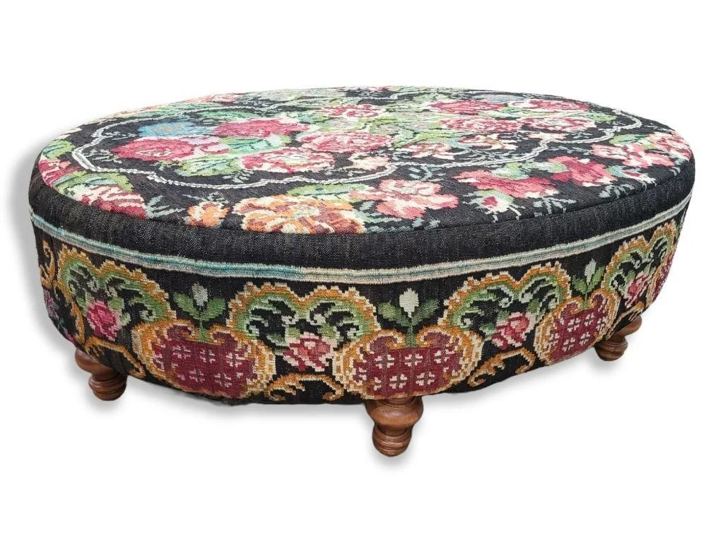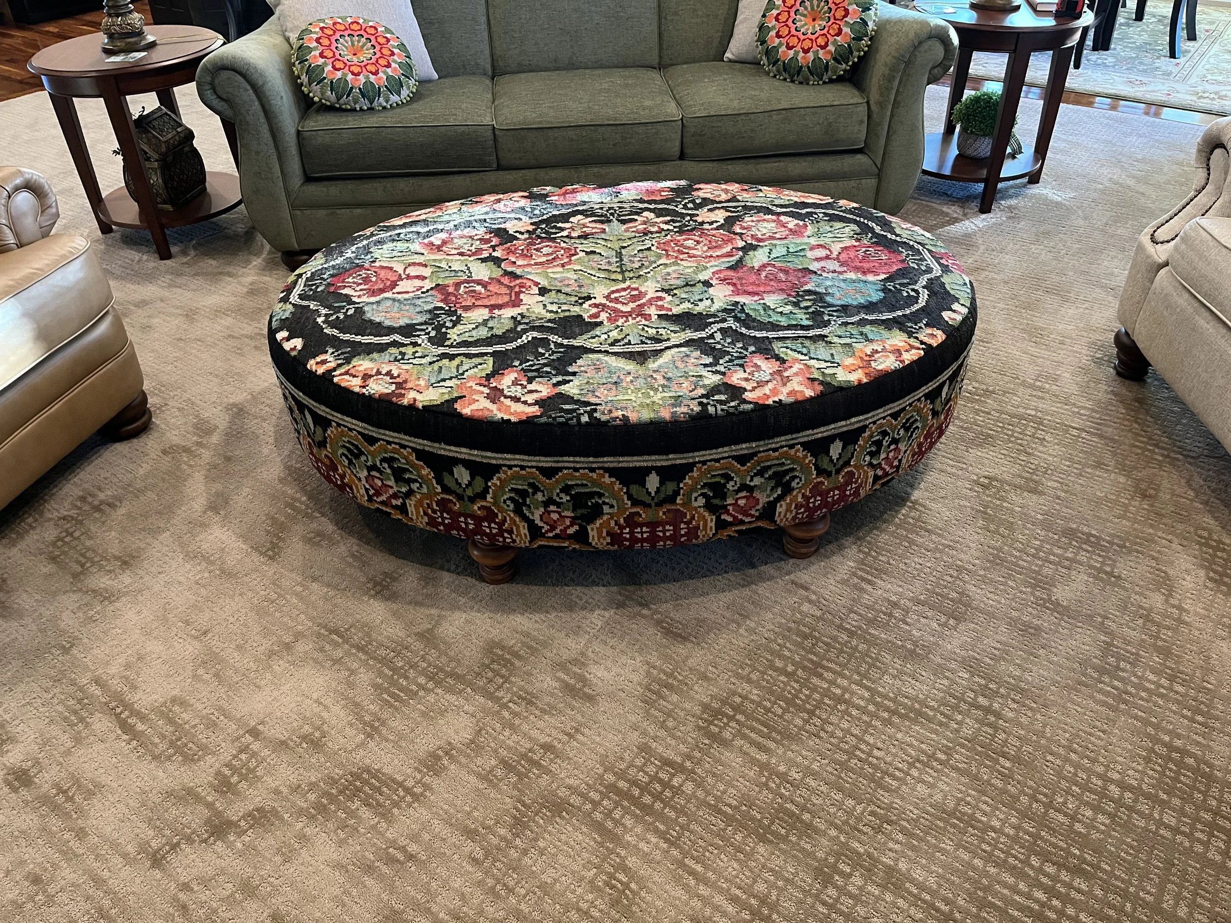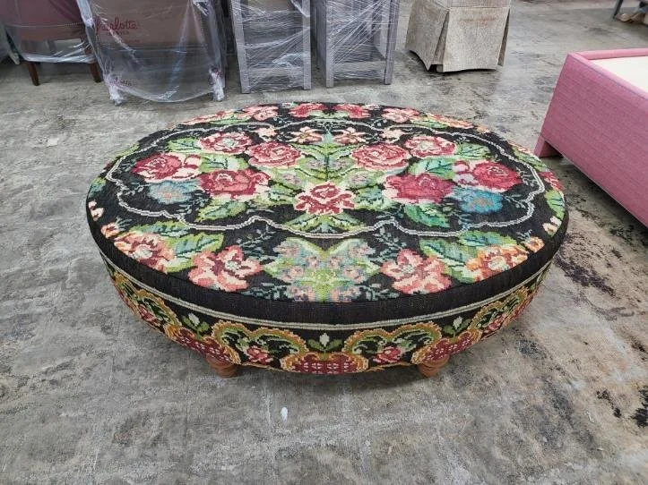 Working on this project with Greg Thayer, a grandson of Edwin, was truly one of the most fun projects I have ever had the opportunity to be a part of! We sent him the rug, and the dimensions we wanted the ottoman to be. He would call and text with pictures of what it would look like in different oval shapes using the design of the actual rug.