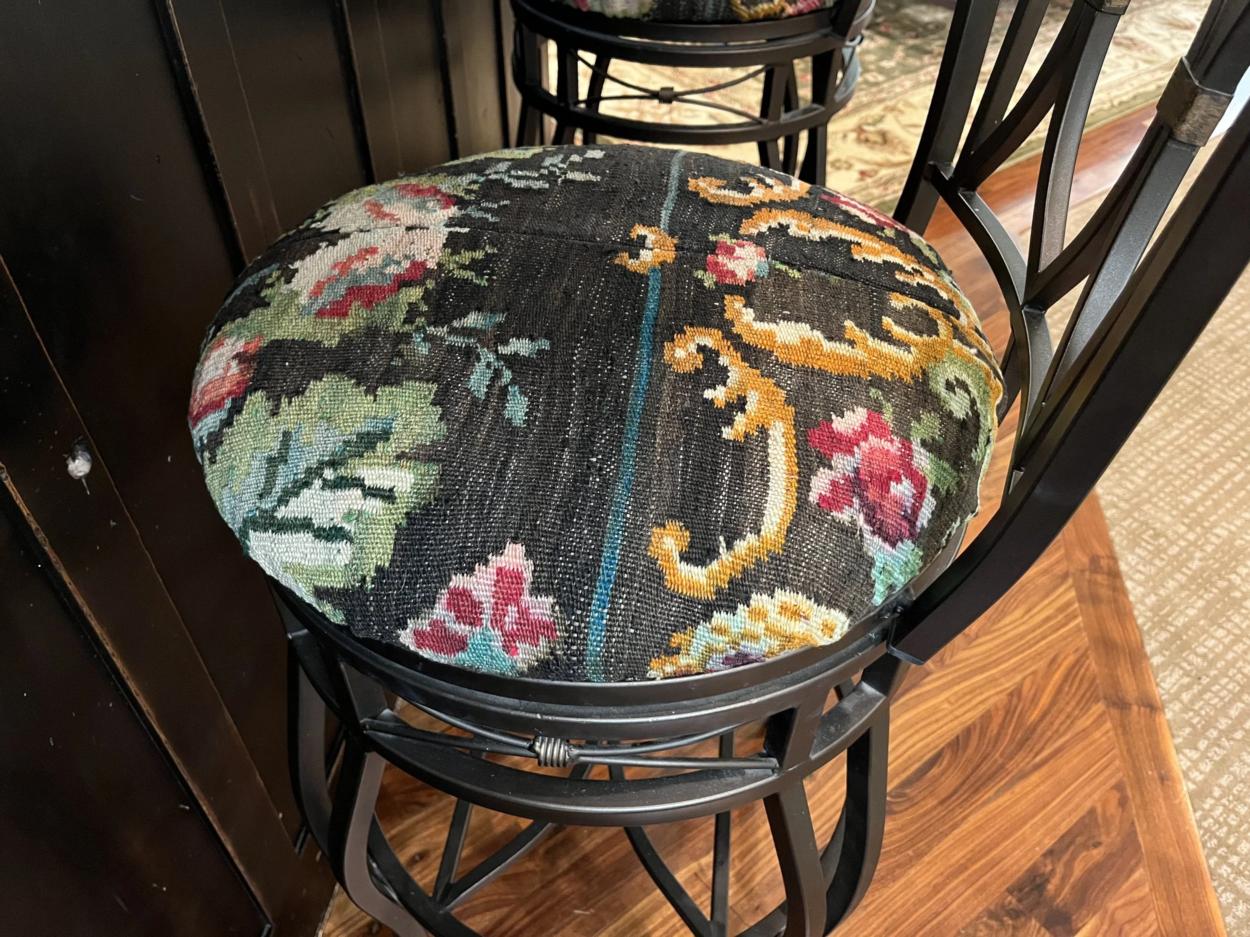 It was not easy working with the ¼” thick heavy wool material! In the end, we used almost every square inch of that 8” x 10” Bessarabian Kilim rug! How fun is it that we have re-purposed that rug into a unique piece of furniture, built to last for generations.