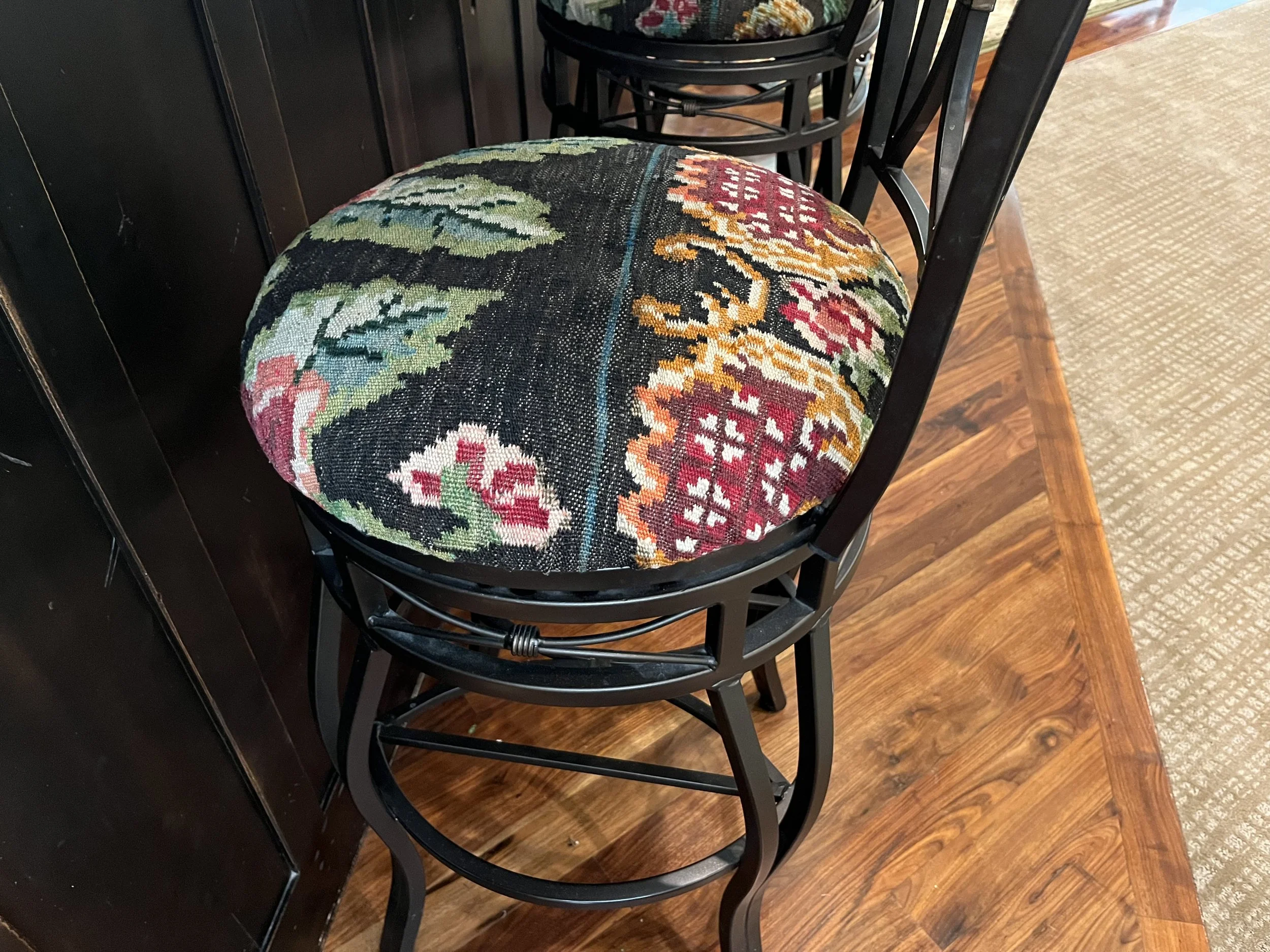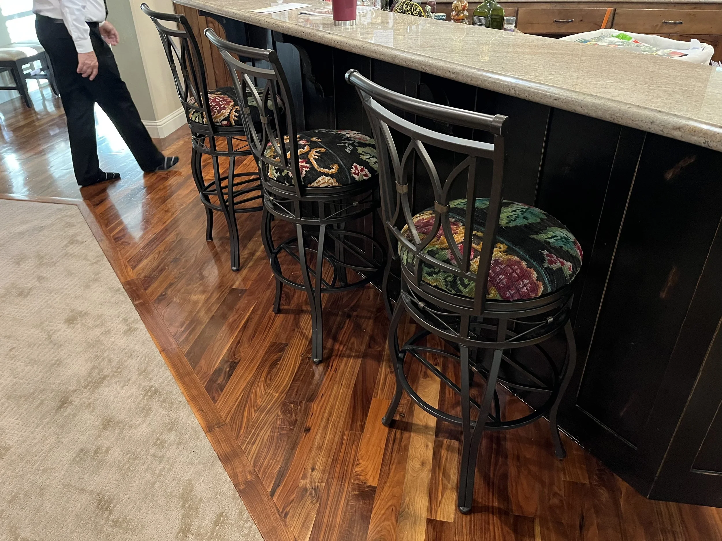 We wanted the center of the rug to be on the top of the ottoman, and the border of the rug to make up the side edges. Greg nailed it! He even sent back the scraps that were left over and we covered three existing barstools with those scraps. After cutting and covering those barstools, I have an even better appreciation of the fine workmanship the Thayer’s are known for.