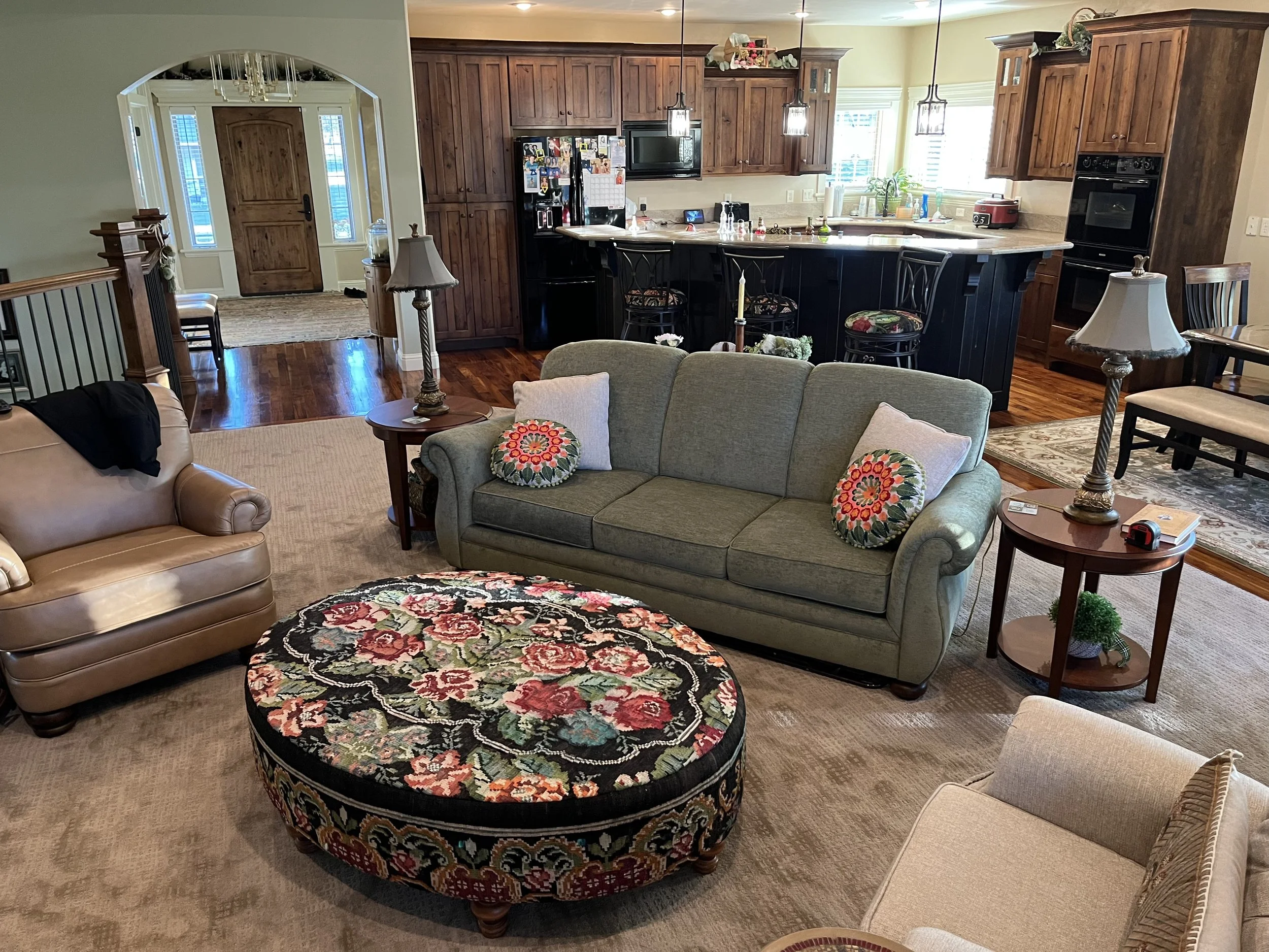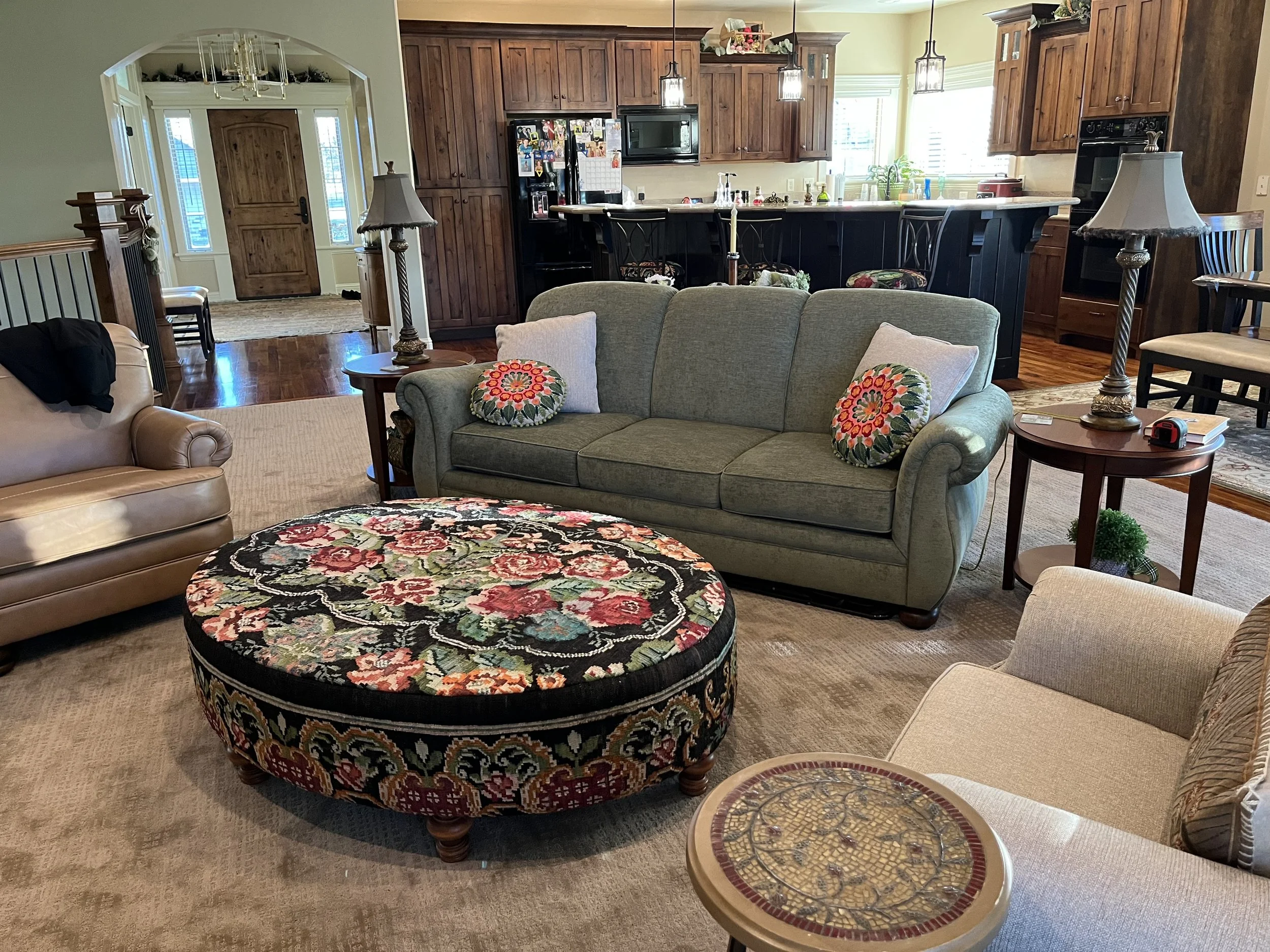 For this home in Idaho I learned this couple is very traditional, and not interested in the latest fads or trends of the day. We went with basic neutral colors in the couch and chairs because I had an idea for an ottoman that would become the focal point of the entire room. Yes, the couch is green! Did you know green is a neutral color? This was the choice of the customer, not my own, although I wholeheartedly supported her choice. :) Hence the search began to find the perfect Kilim rug to cover the large oval ottoman that I had in mind.