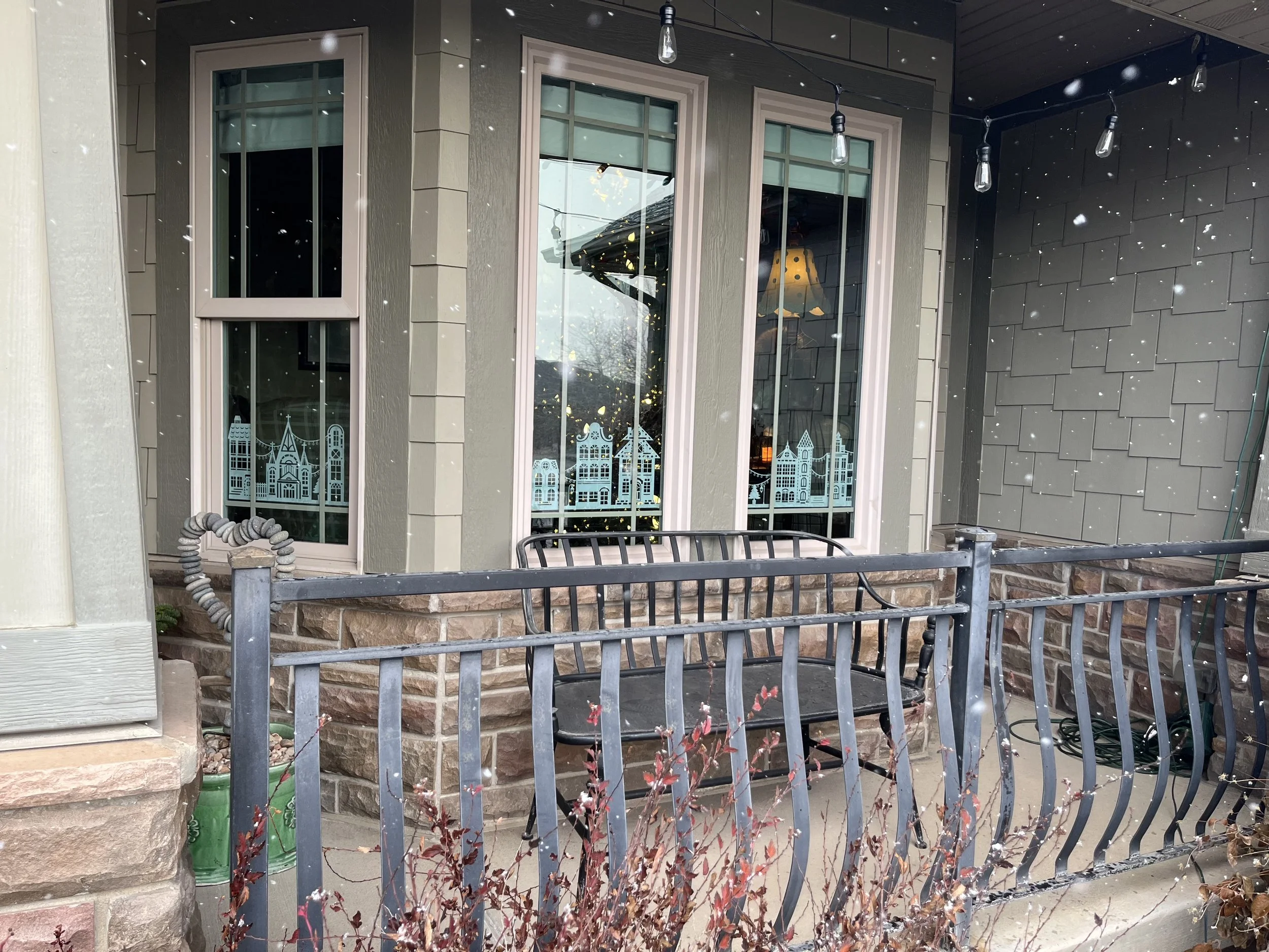 I had originally thought of designing some line-art village designs, printing them off, taping them to the outside of the windows, and then tracing the lines with white chalk paint markers. After further research, I discovered most of these markers are oil based and take a long time to dry. Not wanting to get paint on the back side of my cloth Roman shades, I began searching for alternatives. This is when I discovered these adorable, non-adhesive, vinyl cling window villages on Amazon! I ordered two different options, and I’m glad I did. The one I thought I liked the best was HUGE! The houses would have covered a large majority of each window. I wanted something smaller with stars and snow in the sky above the village.