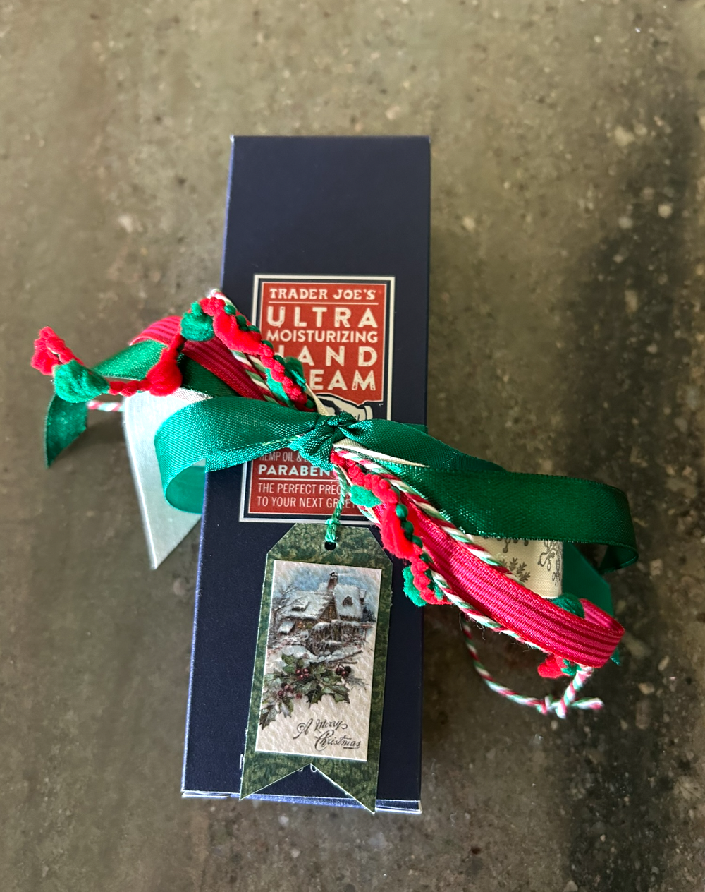 However, I still love helping her with her personal shopping for neighbors and friends. In the past we have wrapped up a roll of paper towels in cute Christmas tissue with a lovely ribbon bow. Another year we did the same with a roll of toilet paper. That was not in 2020 though as toilet paper was scarce and precious to find! 😊 One year we wrapped a box of Kleenex in pretty wrapping paper also with a lovely ribbon bow. Another year she gave nativity ornaments made from cinnamon scented dark bees wax. These were a hit! The past few years we’ve tied bows onto bottles of hand soap. She comes from the greatest generation who survived the great depression in addition to World War II. Because of this, Eileen is extremely sensible, frugal, and likes to give gifts that are needed and can be used. She wanted to change it up this year and do something we haven’t done before. When I told her about the “Hand Cream” from “Trader Joe’s” she said yes, let’s do that.