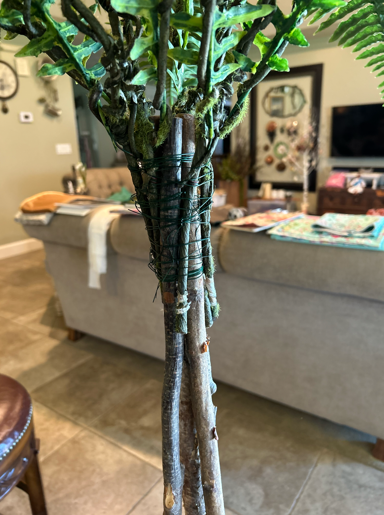 Then I carefully wrapped over the top of the leaf stems, wire and hot glue with a thick diameter of jute twine from Hobby Lobby. This is a type of knot I used back in the 70’s when I made macrame plant hangers, which are actually trending again! 😊 It is called a “Wrapping Knot” or a “Gathering Knot”. You can Google those words to view tutorials on how it’s done. I also love using this knot for the stems of boutonnieres and some more rustic wedding bouquet handles using thinner jute twine.