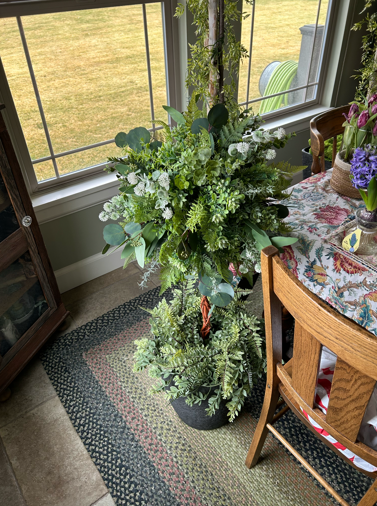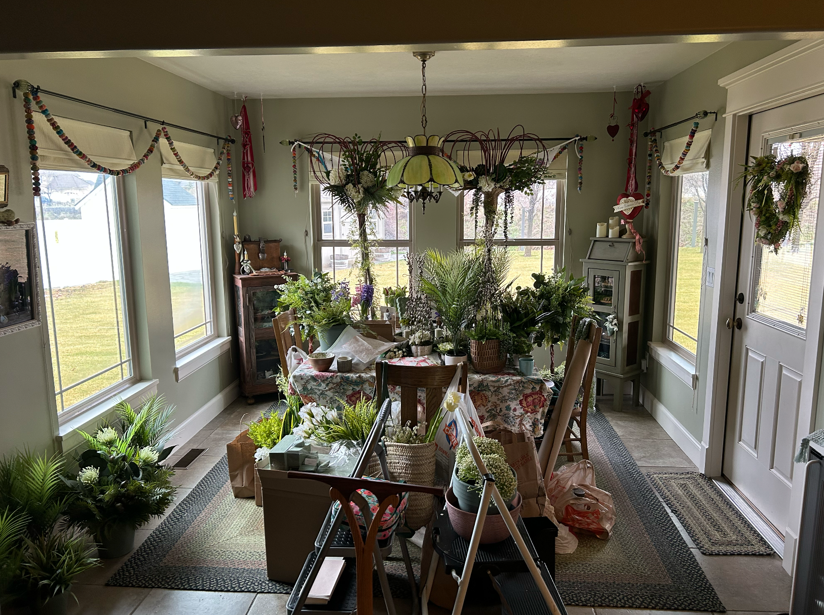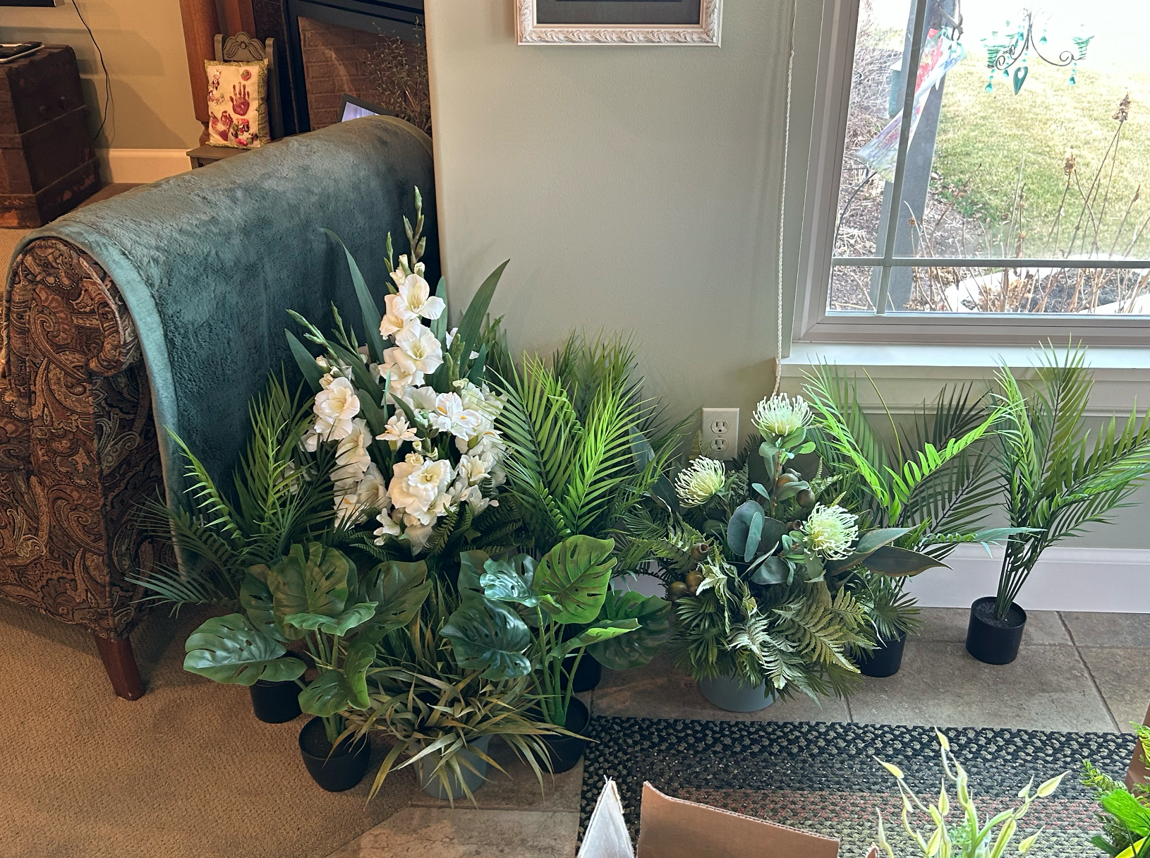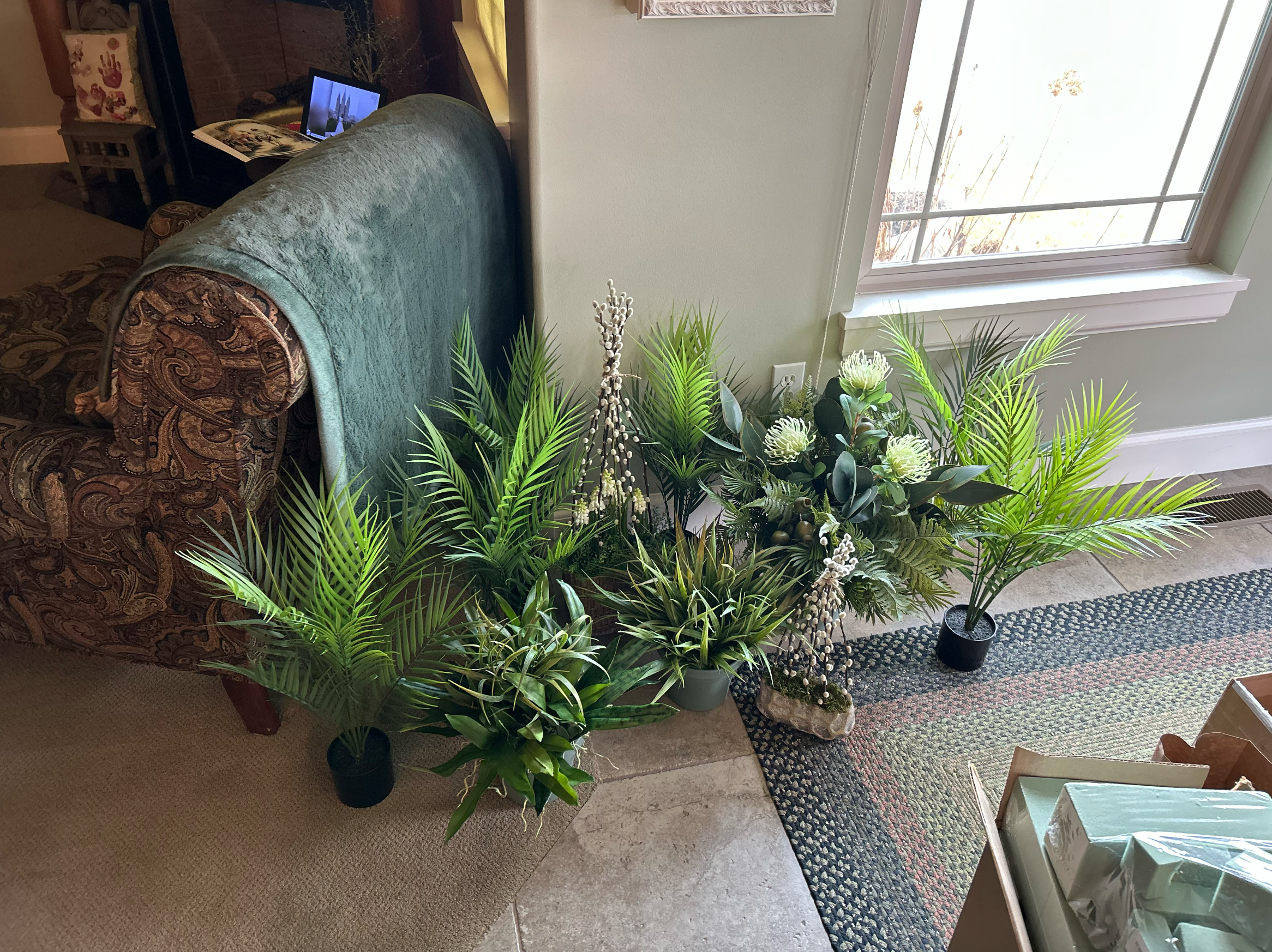 Right now, it looks like a forest in my house! I’ll be glad to see this project to fruition and pray it looks as good as possible on a short time frame and shoestring budget. I wish I had an Olympic sized budget to go out and purchase all the olive trees, palm trees, and native looking faux grasses to pull this off but reality kicks in.