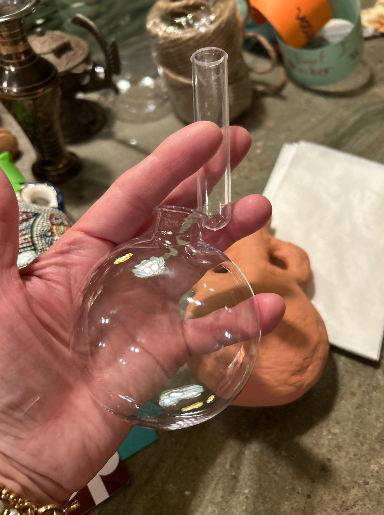 I am using plastic Christmas ornaments my friend gave me for the base part of these flasks and then adding a plastic floral water tube inside the opening of the ornament to create a foundation for the neck of the flask and the opening at the top. Once they are dry, I cut a cork to fit in the top. These will be tied on each woman’s belt. I love how they are turning out. I’ve also never made any of these before. They are primitive but look realistic to me.