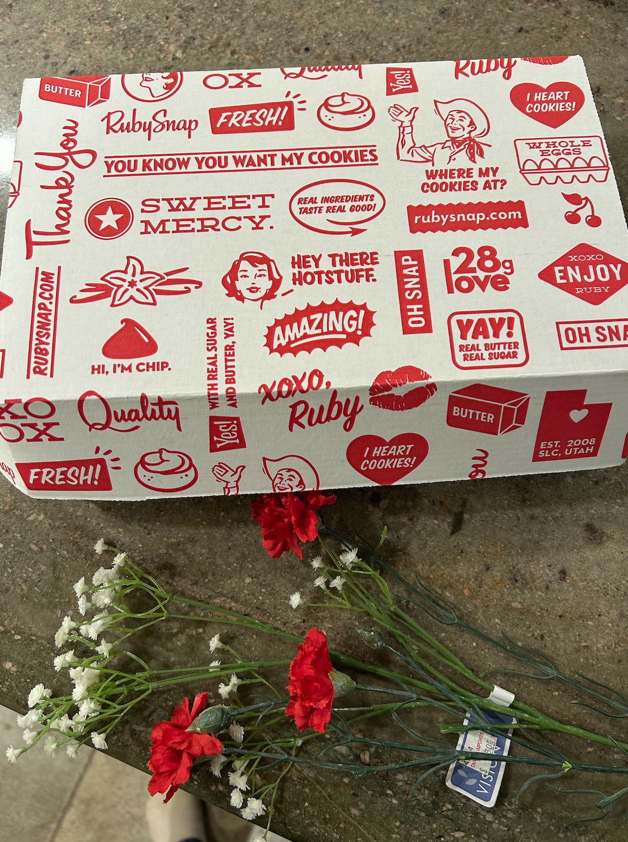 In addition to picking up the supplies for her boutonniere today in Salt Lake City, I also stopped at my favorite cookie shop – “Ruby Snap” and bought a little treat to have for her when she came.