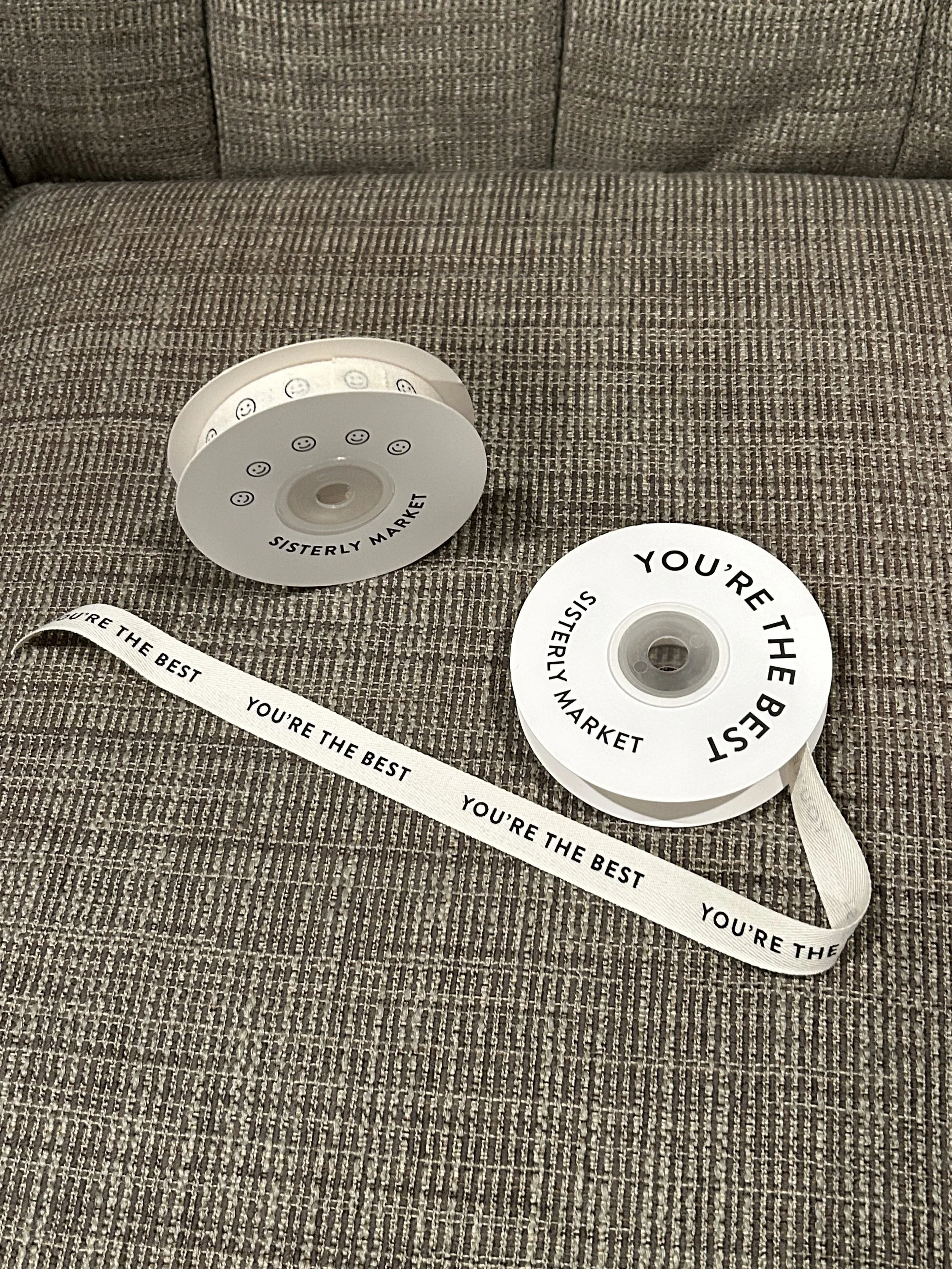 I do love their printed twill tape ribbons from “Sisterly Market.” They have some that say “YOU’RE THE BEST” - “THANK YOU” – “YAY!” – “OH BABY” – SMILEY FACES – HEARTS - “THINKING OF YOU” – “YOU GOT THIS” – “BEST DAY EVER” – “CONGRATS” – “GOOD LUCK” – “HAPPY BIRTHDAY” – “I LOVE YOU” - and a few others. Here is the direct link to these. There are other less expensive brands that look identical, but I love to support this brand in particular.