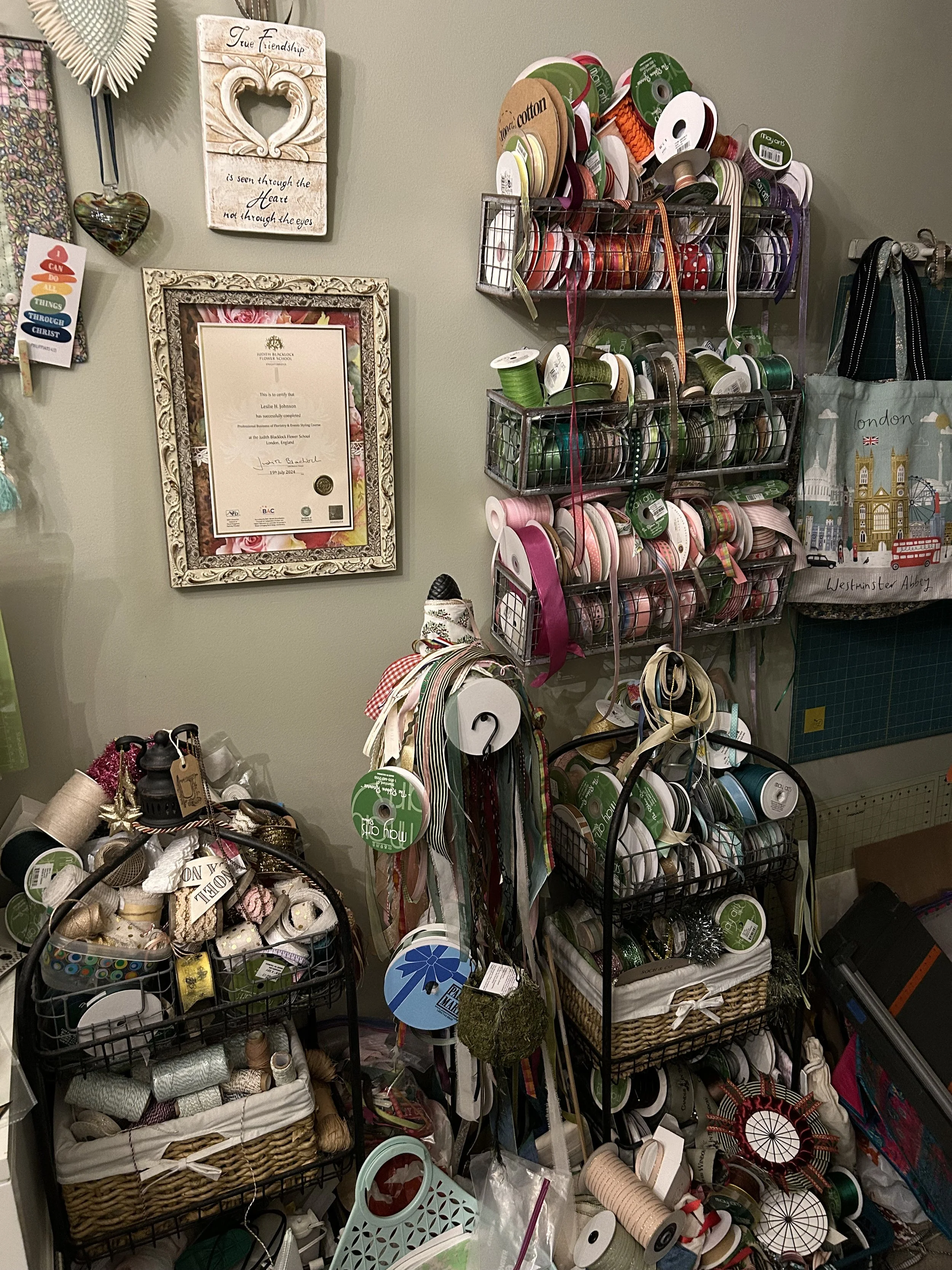 /Ribbon is one of my greatest weaknesses! My granddaughter came in and looked at my collection a few months ago and simply said, “Grandma Les, you have a ribbon problem.” She’s not wrong, but it’s a lovely problem to have.