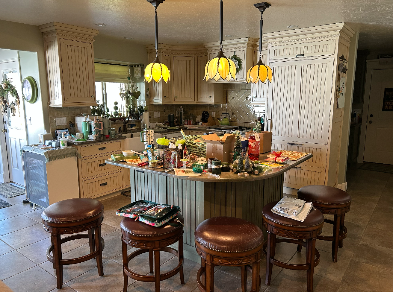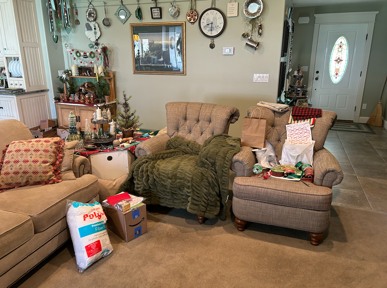 42 years is a long time! I’m so blessed and grateful to live this beautiful, messy, challenging at times, LIGHT filled life with Ronnie! And now I’m off to get my last client project finished so that I can clean the house up, and finish getting it decorated for Christmas. At least I got the tree up over the weekend – although I prefer to get that done the day after Thanksgiving. Better late than not at all . . . I walked around today and took pictures of the beautiful creative mess . . . It’s clean underneath the clutter that moves around on a daily basis. Tomorrow it will all be put away and cleaned up for good, with hopes that I can now “Be Still” and enjoy the rest of the days before Christmas.