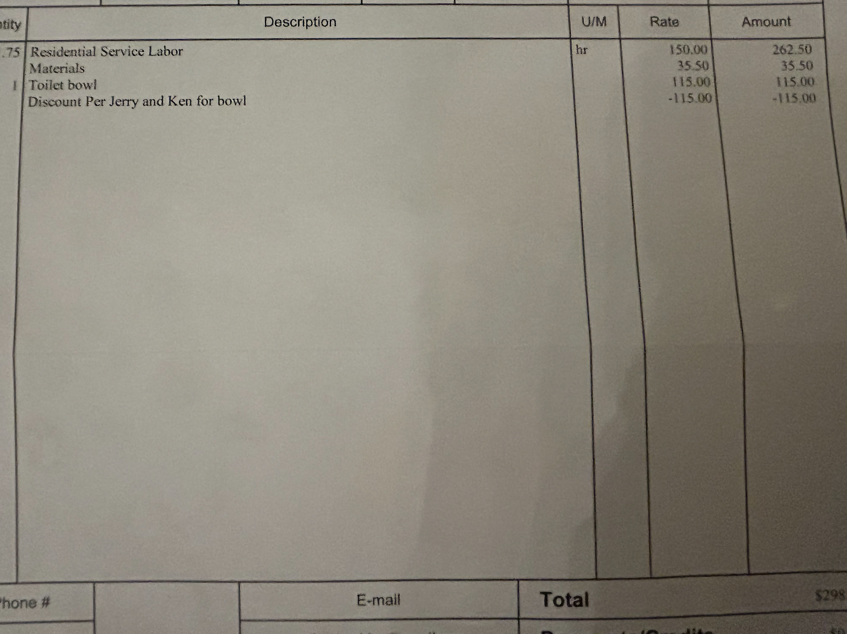 I wasn’t looking forward to the bill, but when it came I was pleasantly shocked and surprised to see that we had only been charged for the time to change the toilet out. All the parts he used were shown and the price listed, but then there was a credit for all of them. We didn’t have to pay anything at all for the base of the toilet, and the other parts he changed out on it!