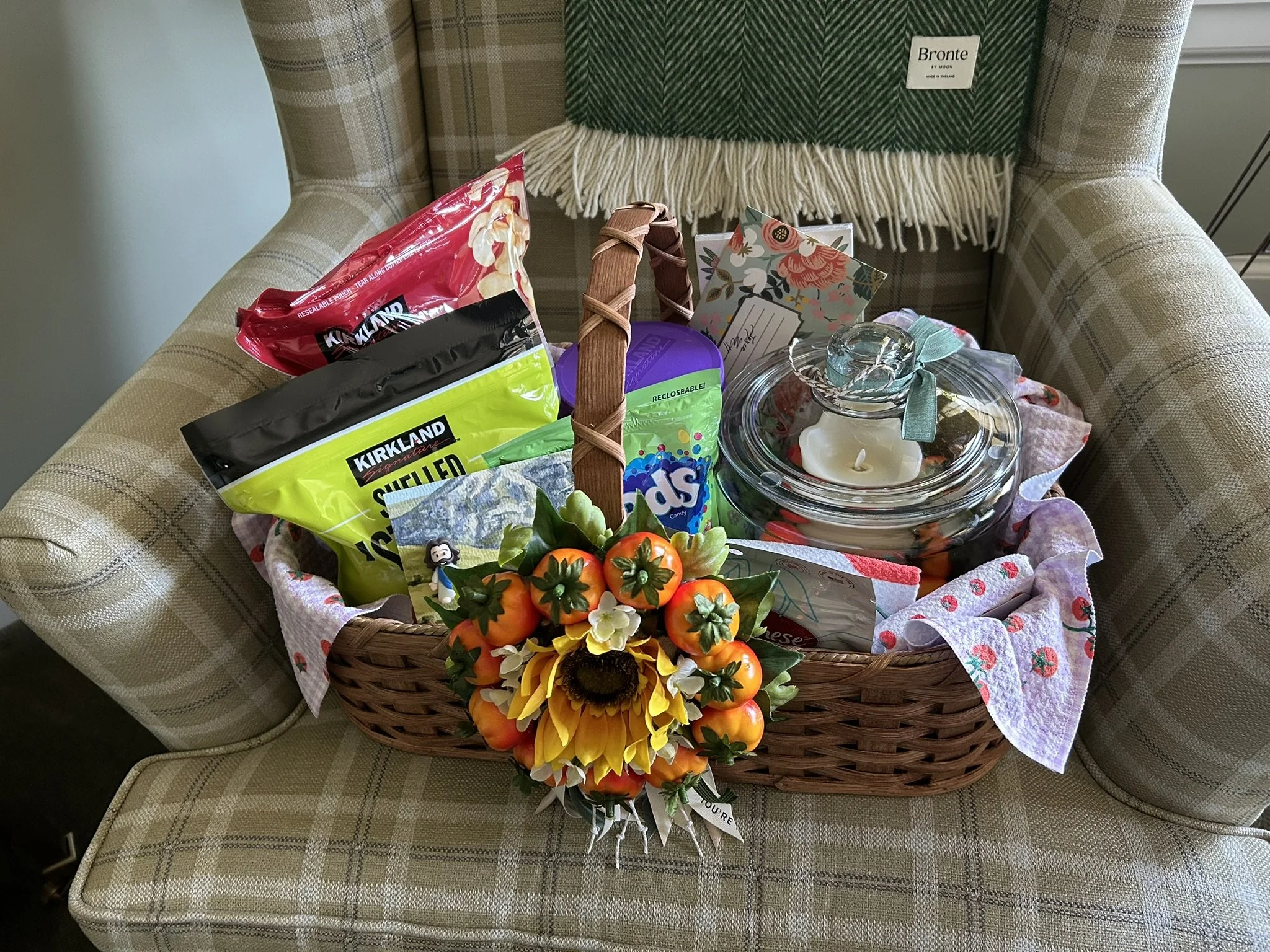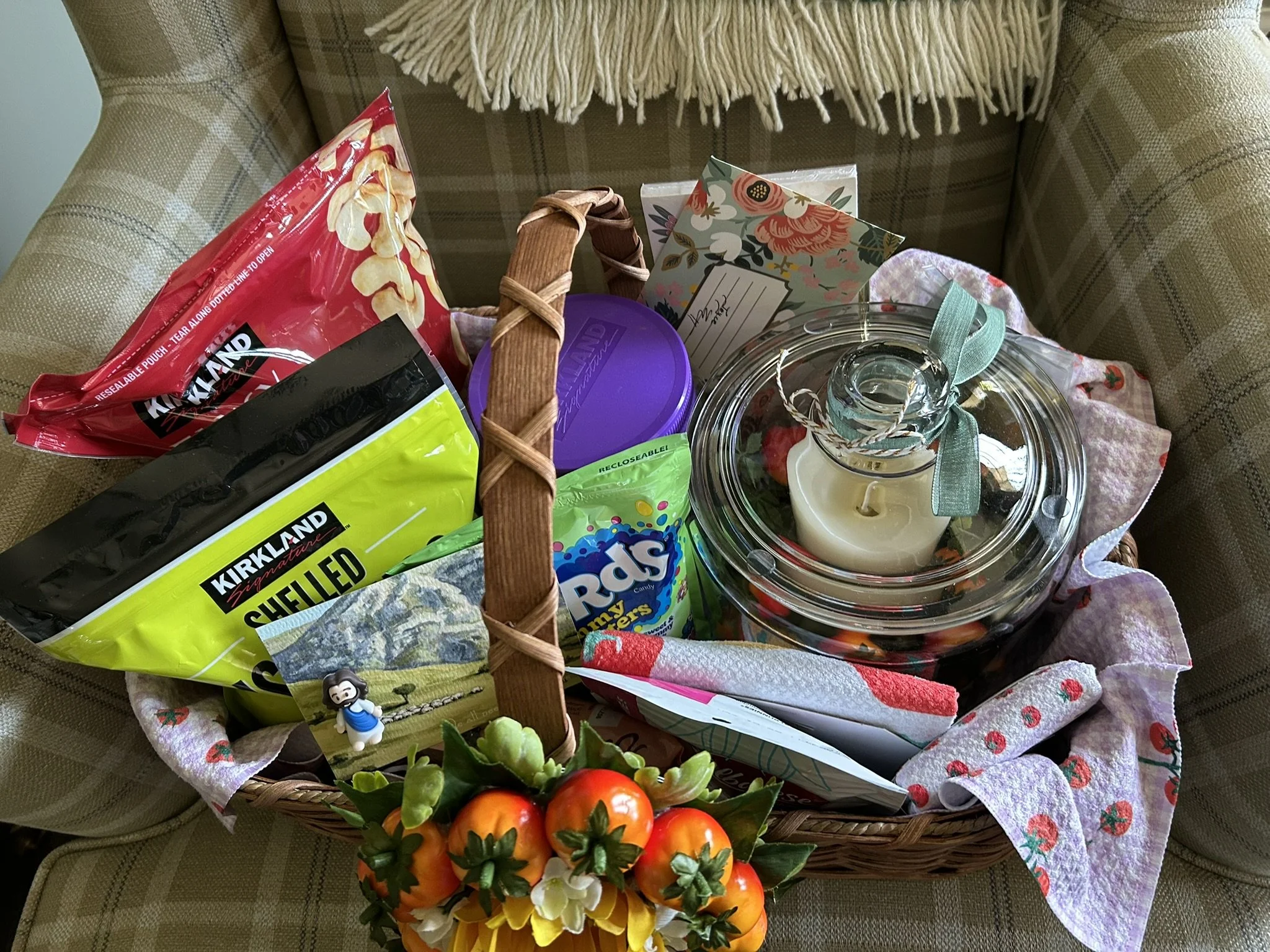 Sometimes the gift is a simple glass jar with a favorite battery operated “Luminara” candle inside, wrapped with a simple strand of realistic looking faux greenery in the bottom of the jar. Other times I order a basket from my favorite Amish basket makers in the Midwest, line it with a meaningful dishtowel, and begin filling it with treats, books, and other items I hope the family will enjoy.